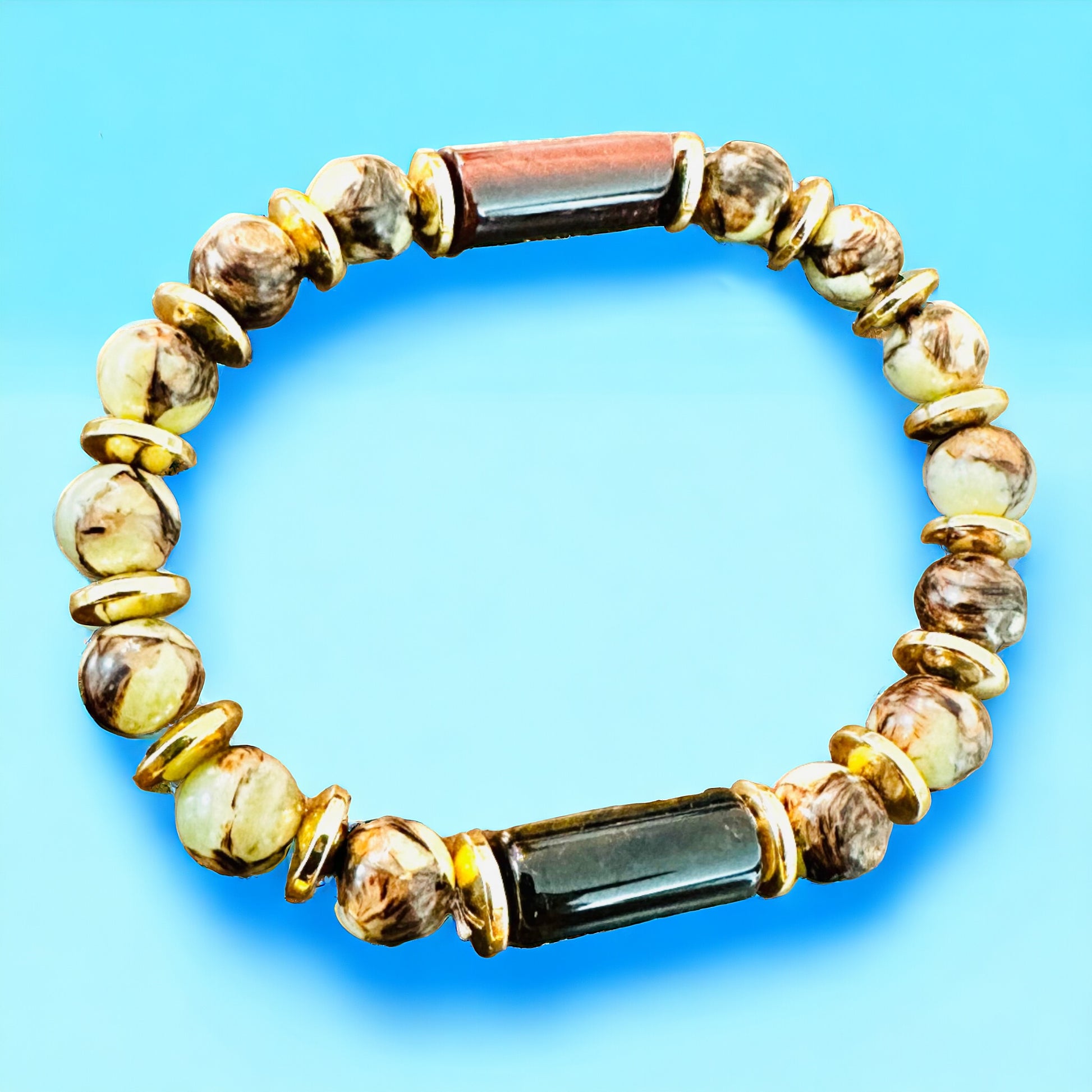 This handcrafted Jasper Hematite and Tiger's Eye Stretch Bracelet features one-of-a-kind earth-tone colors, including shades of brown, black, and gold copper.