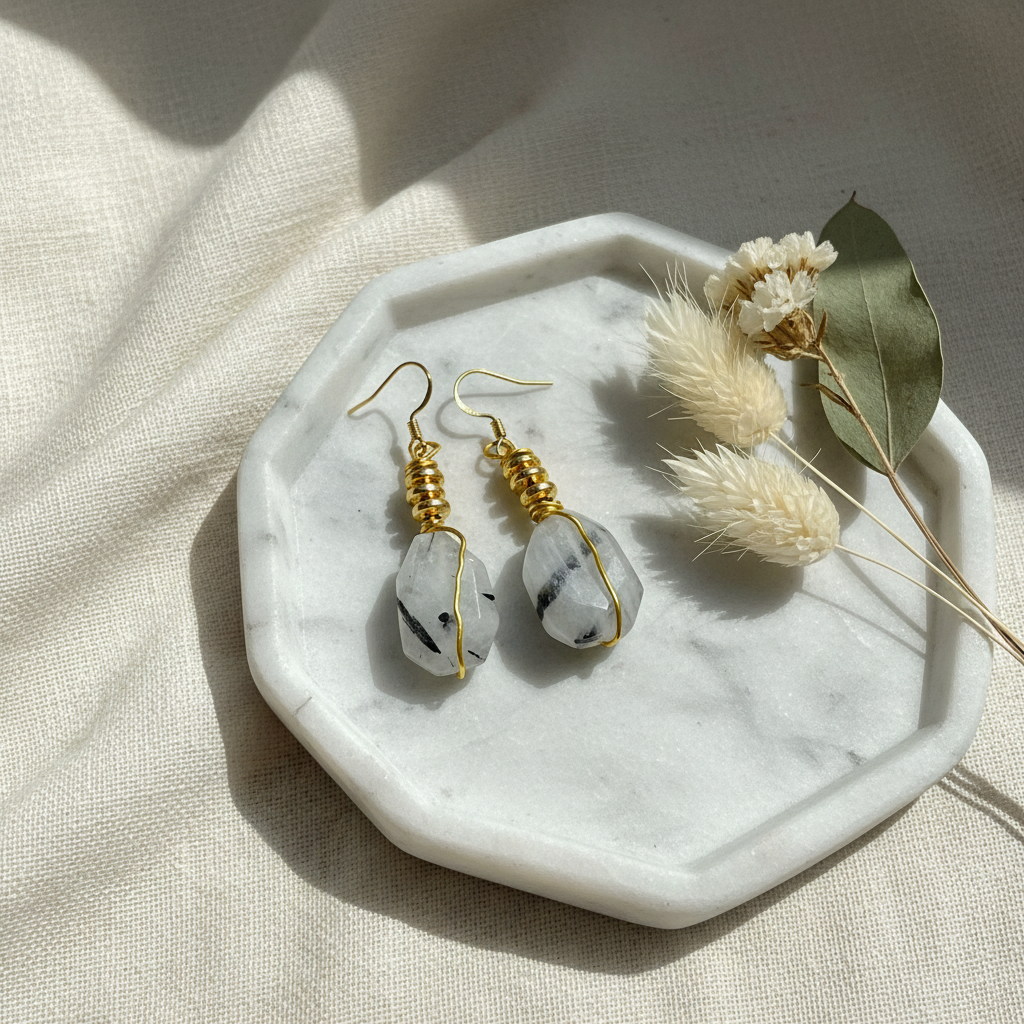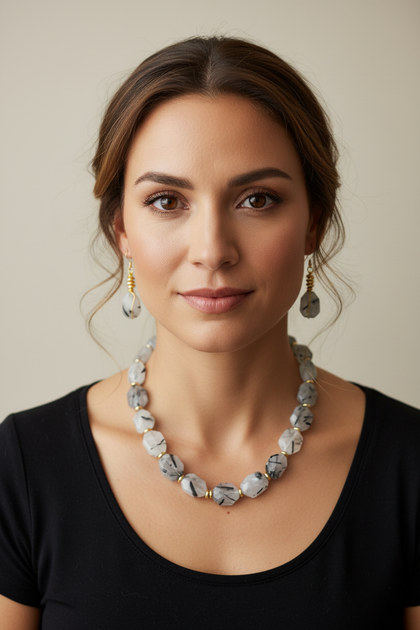 - Gemstones: Black and white rutilated quartz, hematite