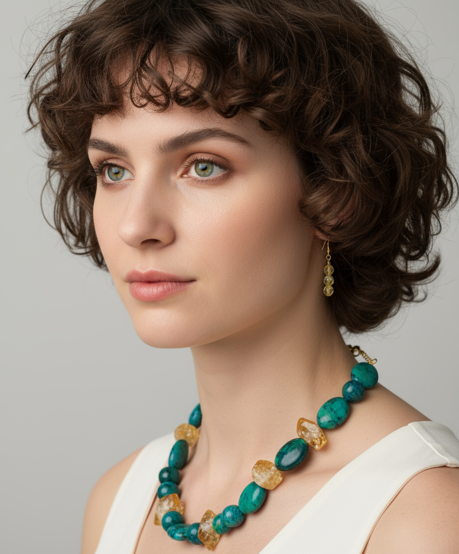 Indulge in the luxurious and exclusive "Bohemian in Me" necklace set, featuring a beautiful Chrysocolla and Yellow Quartz stone. Each piece is one of a kind, making it a truly unique addition to your collection. The colors are rich when placed together, a bit of vibrance and elegance combined.
