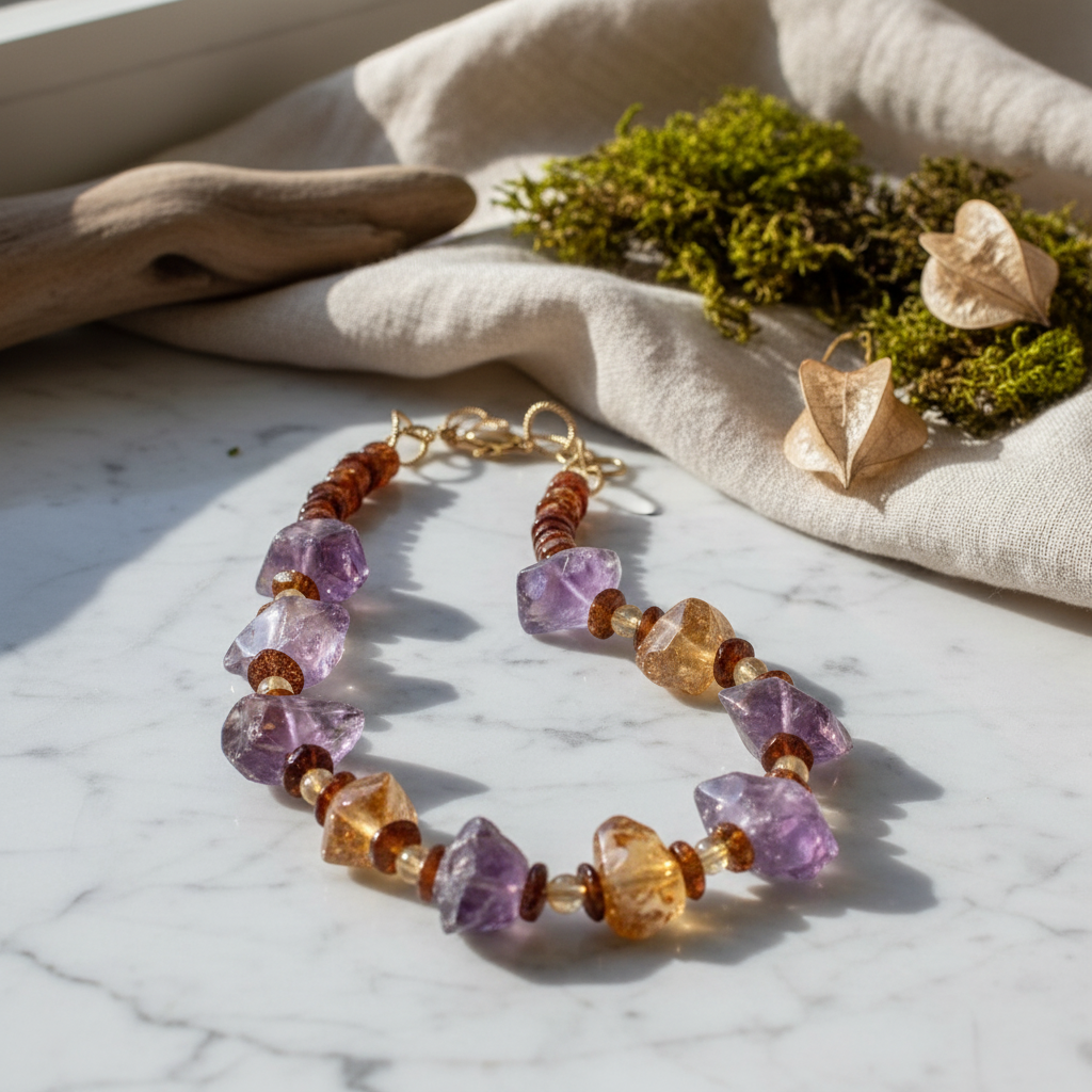 Together, this trinity represents spiritual wisdom (Amethyst), divine abundance (Citrine), and grounding protection (Amber) - a powerful combination for bohemian souls seeking balance between heaven and earth.