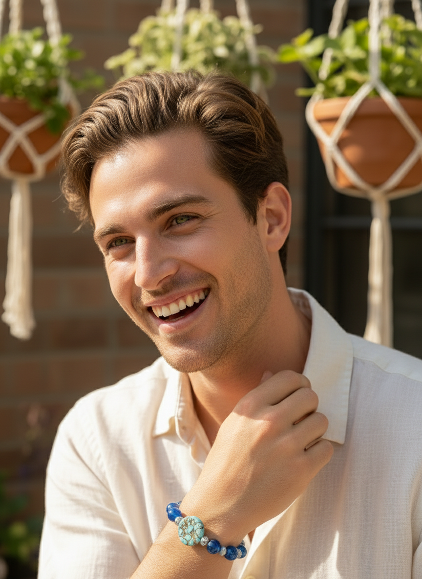 Elevate your style with this handmade stretch bracelet. Constructed with Turquoise, Agate, crystal, and black accents, it's the ultimate choice to invigorate your look.