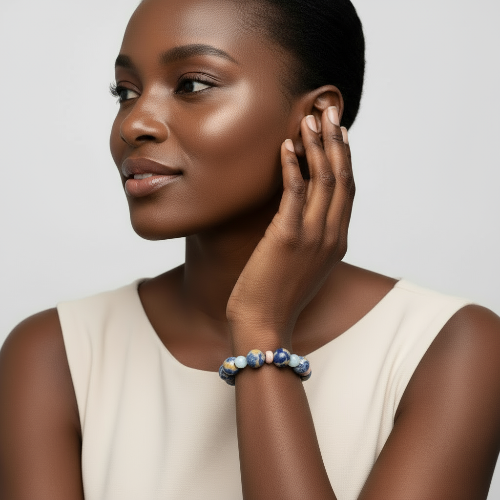 This unique bracelet is crafted with blue and orange sodalite stone and African opal. The special combination of colors creates a one-of-a-kind piece that captures the look and feel of the sand and the ocean. Handmade with care, this bracelet is sure to become a favorite accessory.