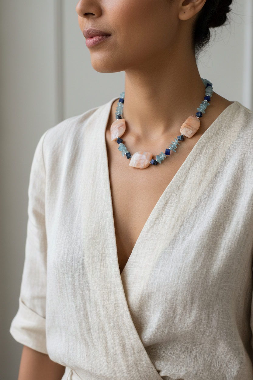 A unique 22-inch statement necklace with matching earrings, handcrafted in Woodland, California. This exclusive set features aquamarine, lapis lazuli, sunstone, and hematite gemstones with copper-dipped, silver-plated glass accents. This piece embodies bohemian luxury and natural stone energy.