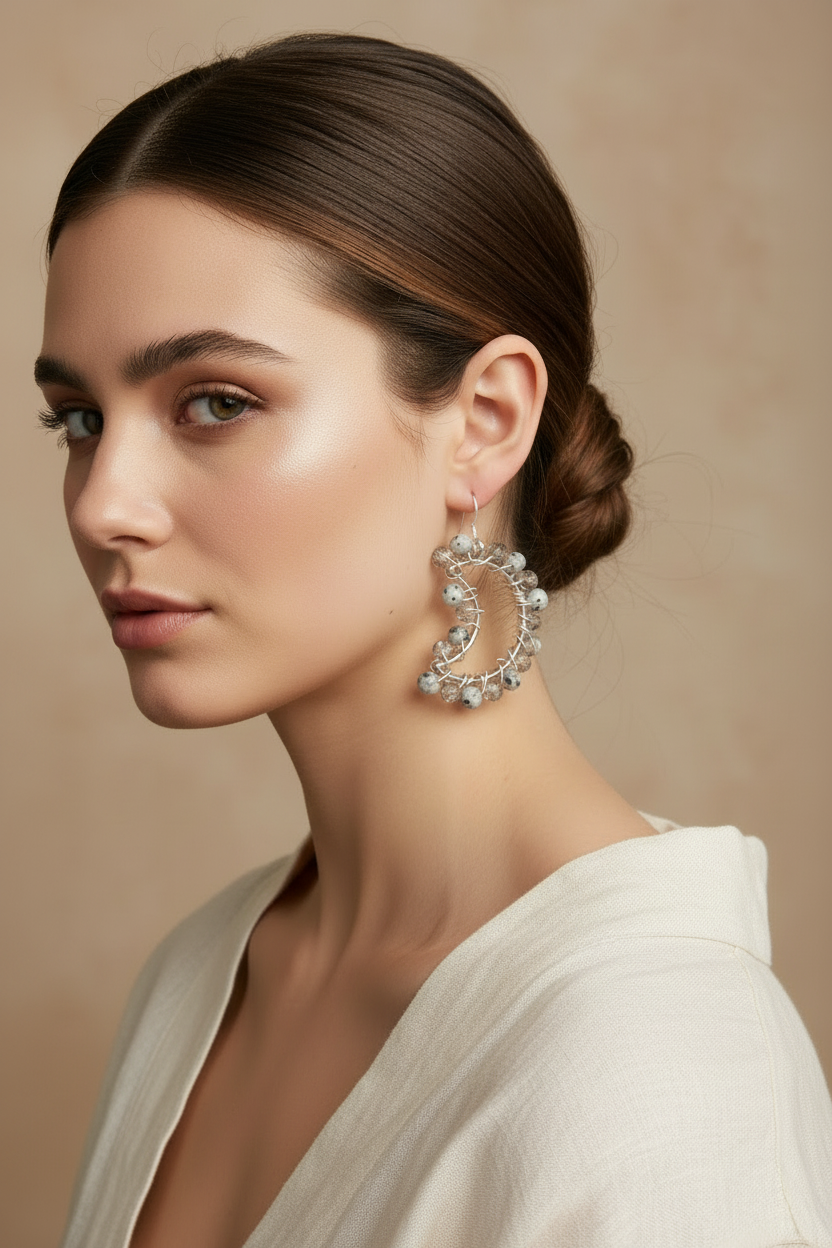 Embrace the playful energy of these one-of-a-kind moon-shaped Dalmatian Jasper earrings, handcrafted with artisan wire wrapping and hypoallergenic materials.