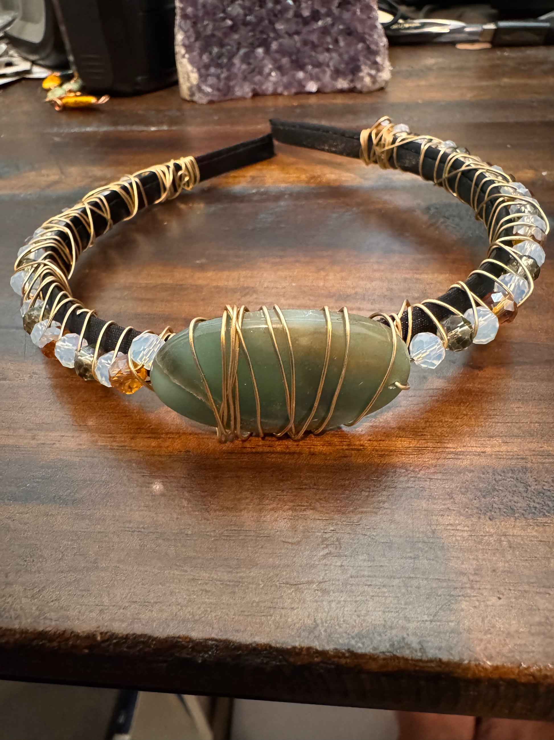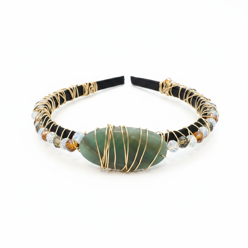 A one-of-a-kind piece from the Halo Line — this jade wire wrap crystal headband is handcrafted with intention. Natural jade stones are delicately woven in sterling silver wire, creating a crown-like silhouette that sits effortlessly on the head.