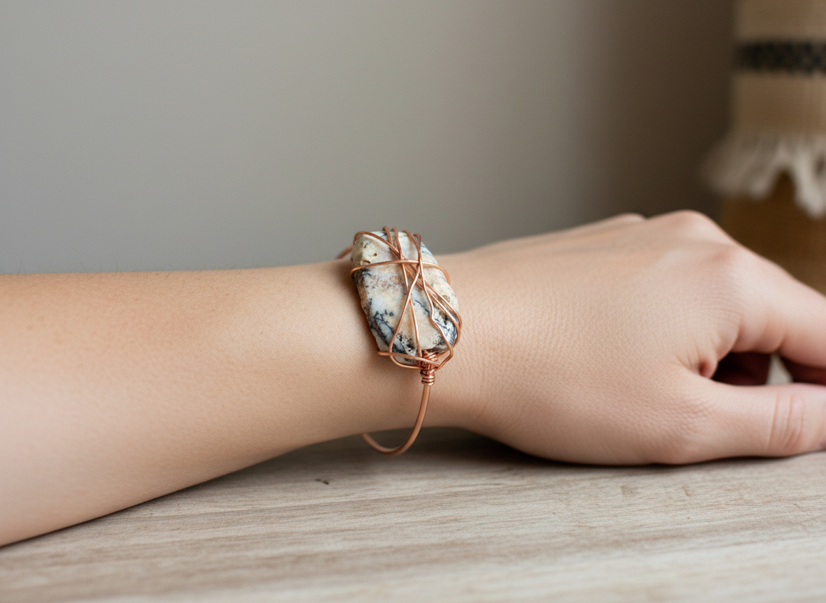 Add unique flair to any outfit with this beautiful one-of-a-kind bracelet! The Jasper stone's stunning combination of brown, orange, and white offers a vibrant vibrance and the wire wrapped copper bangle. Slip this beauty on and let it hug you all day long!