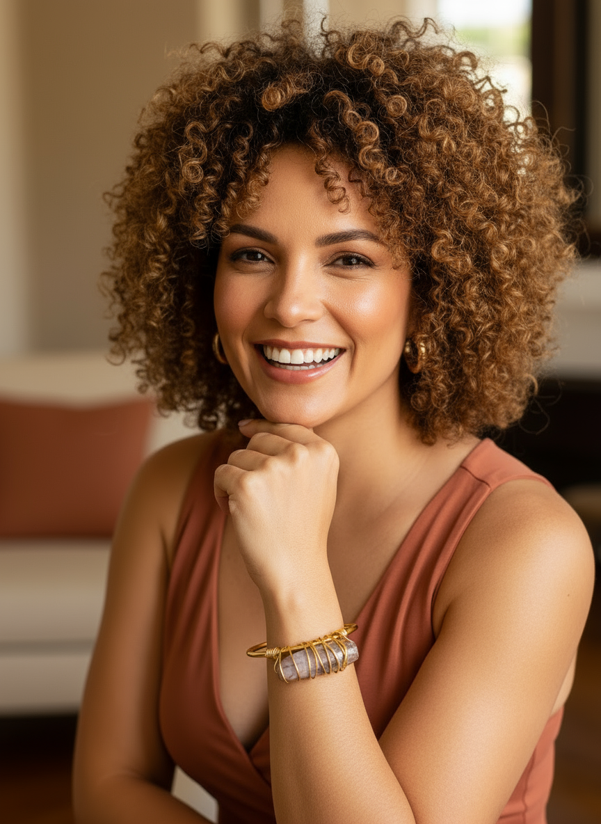 Hold Me is a unique piece of jewelry. Crafted with African opal over 24 karat gold plated copper, this beautiful bracelet is one of a kind. Its size is for wrists 7 to 7 1/2 inches.