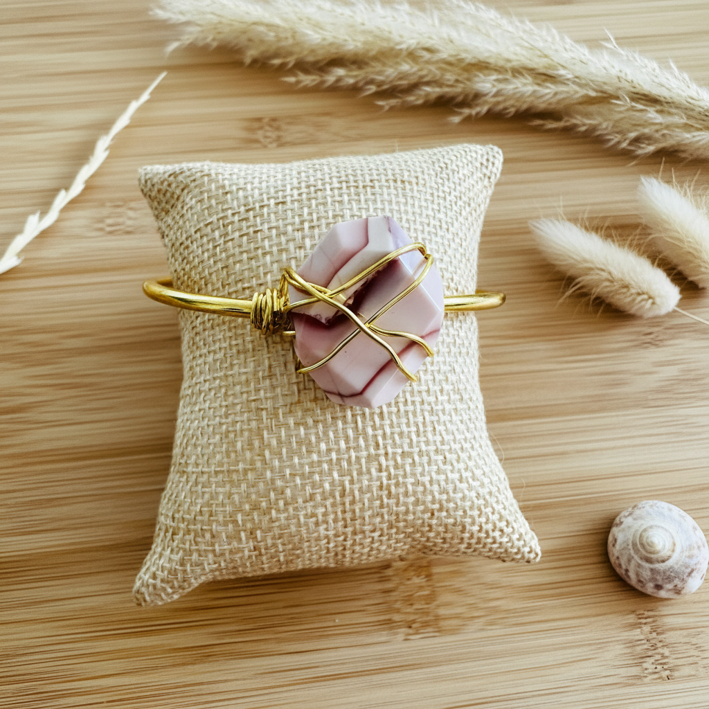 Hold Me is a stunning bracelet featuring African opal wire wrapped with 24 karat gold over copper. The bangle is composed of wire wrapped and fastened to create a unique and elegant design. Part of the Hold Me Collection, this luxurious piece combines the transformative energy of African opal with the radiant beauty of 24K gold for a truly exceptional statement.