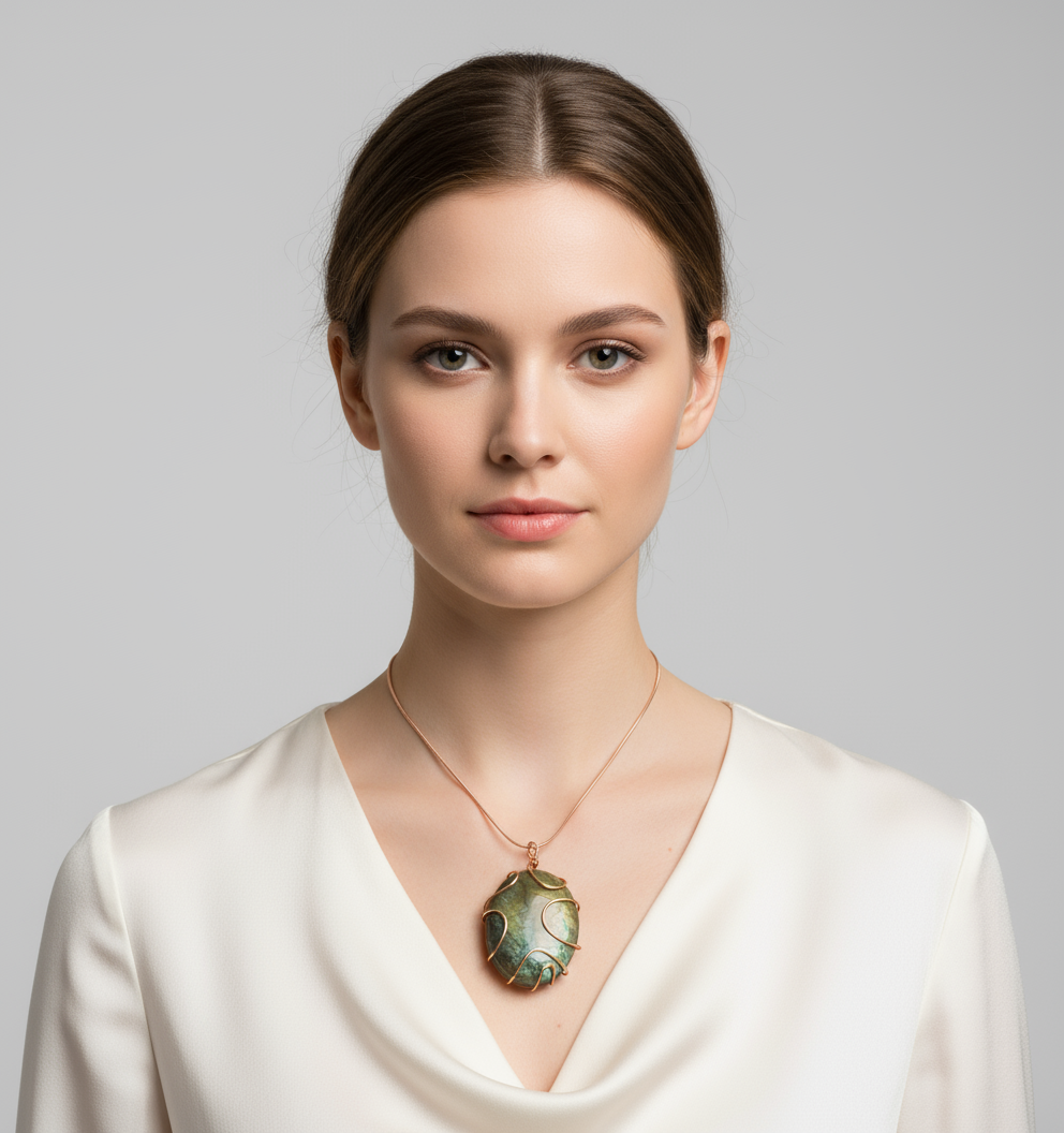 Indulge in the luxurious and exclusive Regime Collection. Elevate any outfit with our one of a kind wire wrapped necklace showcasing a unique Labradorite stone. Make a statement and embrace your individuality with this sophisticated piece. Wire wrapped copper, Available copper rose gold chain, sizes 16, 24, 30 inches.