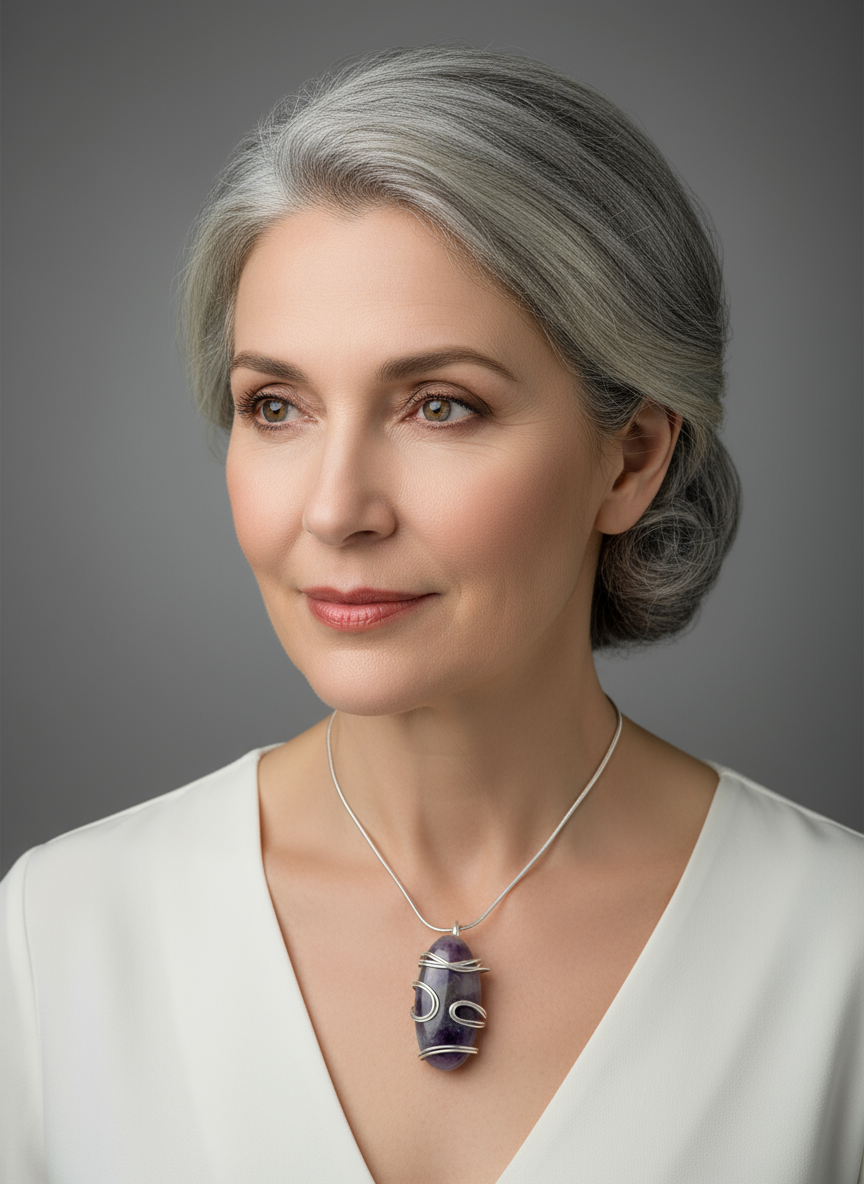 amethyst wire wrapped pendant necklace. Chain silver plated over copper available in 16, 24, or 30 inches. One of a kind. Indulge in the unique beauty of nature. With a one-of-a-kind amethyst wire wrapped pendant necklace, you'll feel like you're wearing a work of art. The delicate silver plated chain, available in 16, 24, or 30 inches, adds a touch of refined luxury to your ensemble. Trust us, you'll never want to take it off.